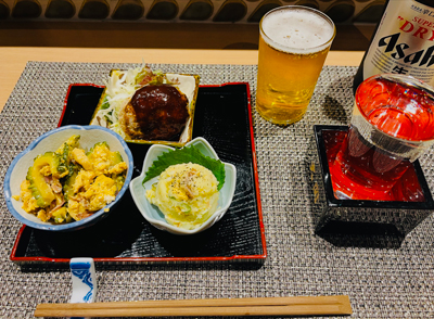 夜の人気メニューはちょい飲みセット!アルコール2杯におばんざい3品が付いて2000円、一品料理は400円からございます。