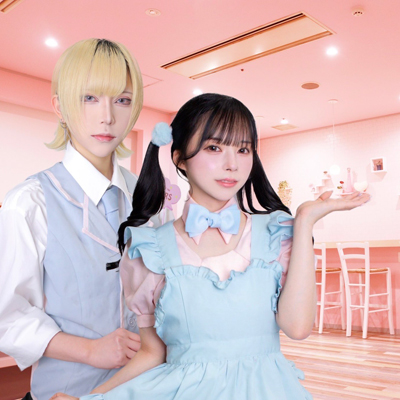 ピンクの店内と可愛いメニュー、女の子キャスト、男装キャストが働くコンセプトカフェです。