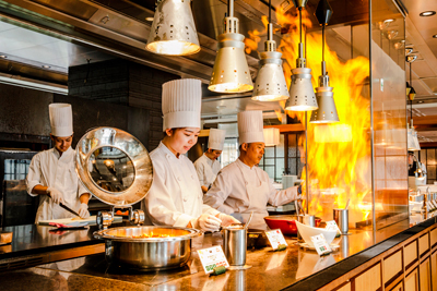 「ヘルシー」「ビューティ」「フレッシュ」をコンセプトに、ディナー定番メニュー『プレミアムローストビーフ』『お寿司』『天ぷら』はもちろん、ランチで人気の『ローストポーク』、デザートコーナーでは専属パティシエが作る『カラフルストーンアイス』など、シェフが目の前で調理するパフォーマンスをお届け。お料理をお召し上がりいただく前にお客様のテーブルへお届けするファーストディッシュは当店自慢の一品。